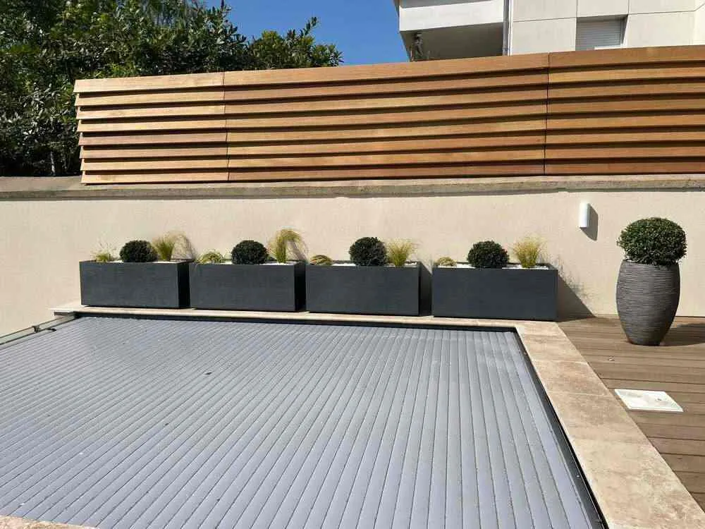 L’aménagement autour de la terrasse et de la piscine a été conçu pour créer une atmosphère conviviale et reposante. L’ajout de pots et jardinières de différents formats apporte du relief et de la personnalité à l’ensemble. Le gazon de placage, associé à deux robots tondeuses, garantit une pelouse toujours impeccable et facile à entretenir.